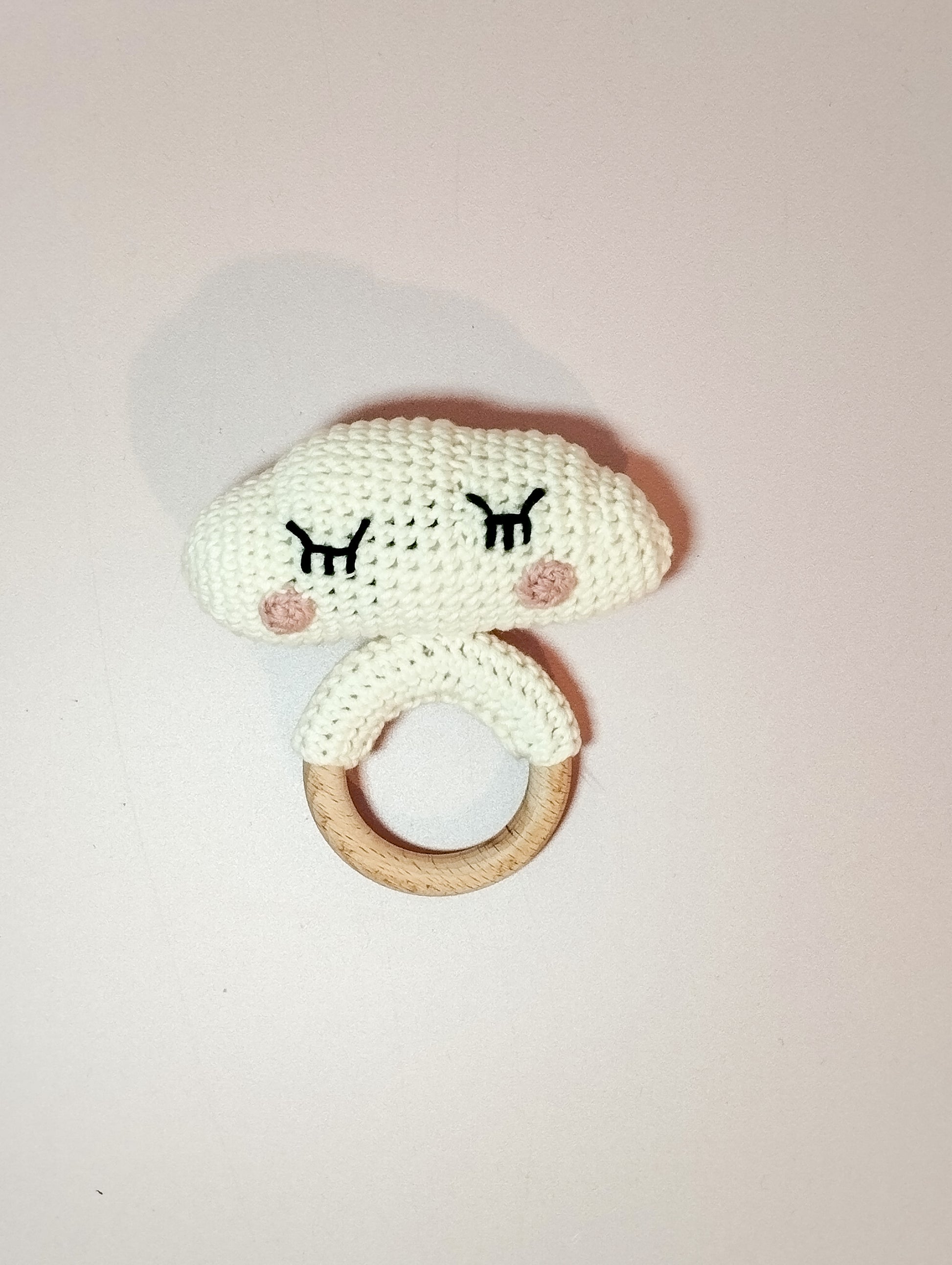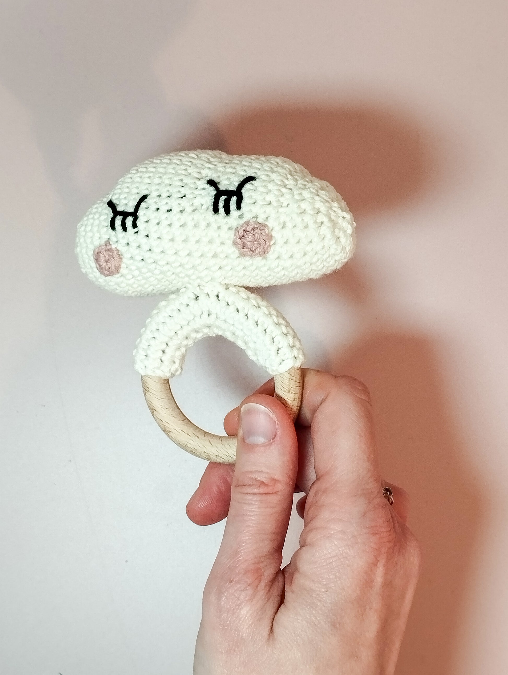 Le nuage est crocheté en coton certifié oeko tex. L' anneau est en bois de hêtre naturel non traité et fait 5cm de diamètre. Le nuage est rembourré avec de la ouate anti-acarien. Un grelot plat au tintement léger se trouve à l'intérieur du nuage