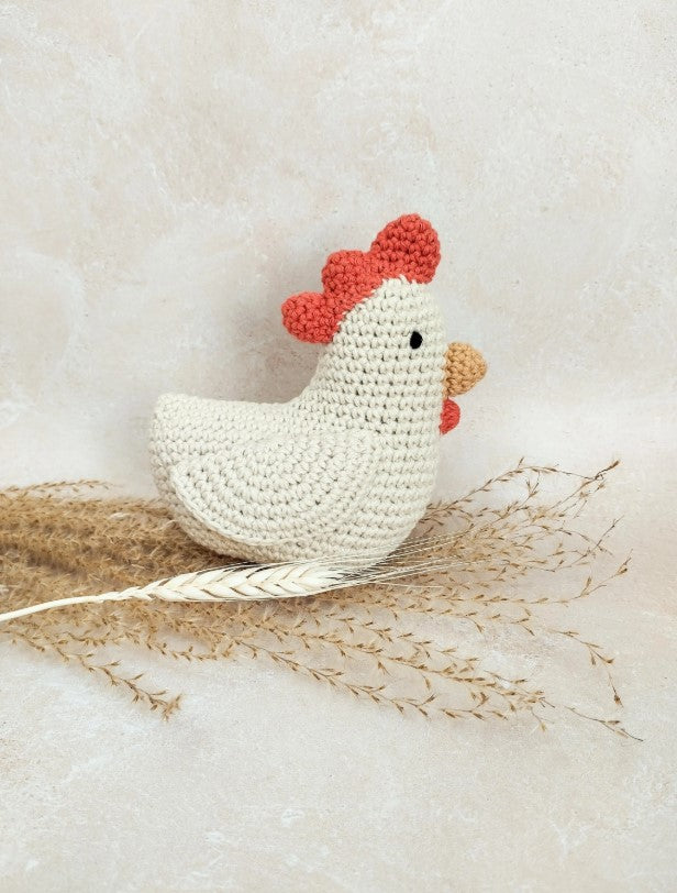Adorable petite poule crochetée en 100% coton certifié Oeko-Tex, parfaite pour les bébés et les enfants.